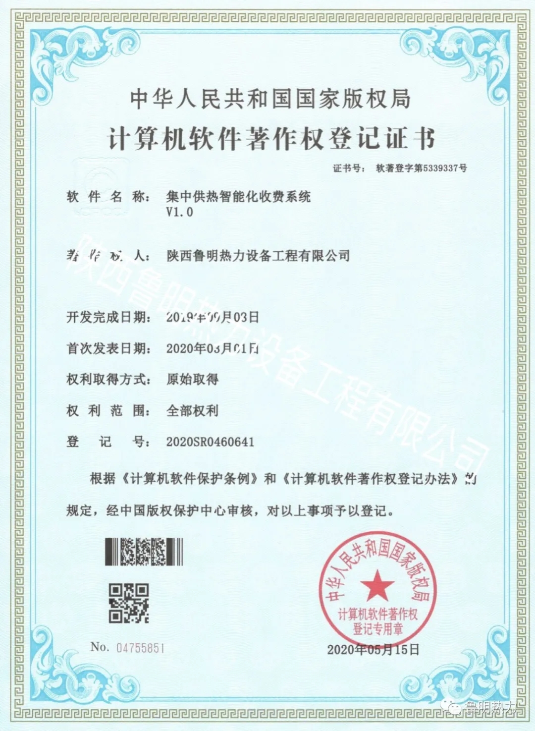【喜讯】公司获得“集中供热智能化收费系统”计算机软件著作权登记证书_陕西板式换热器,陕西换热站安装,西安换热机组,西安管壳式换热器,幸运168飞艇开奖结果号码查询