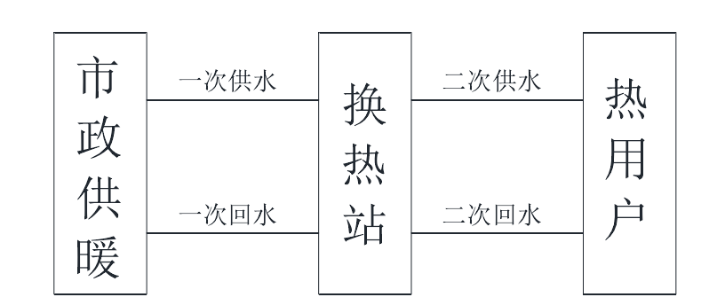 该集中供热系统热源为燃煤锅炉加热的首站高温热水,通过热力公司敷设的一次热力管网系统到达各个小区的换热站,经过各小区换热站换热后变成适合暖气片、地幅热等散热器的低温热水,通过各小区承建二次热网管道送至用户进行散热供暖。整个集中供热系统分为两部分,从热源首站到各个小区换热站之间的管网称为一次热力管网;从换热站到用户的管网称为二次热力管网。集中供热系统的流程图如3.2所示: