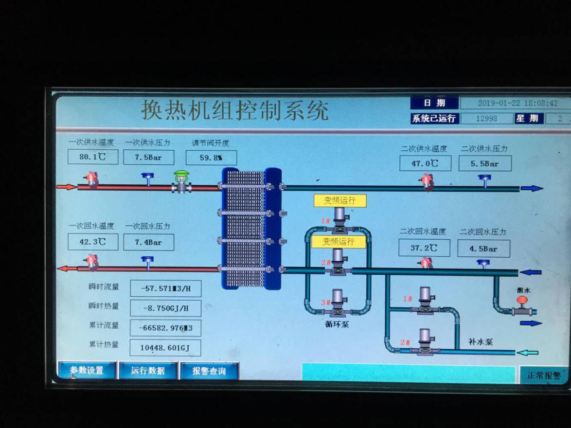 该小区集中供热系统建于2010年并沿用至今,该小区换热站的管理模式一直是人为操作二并非使用计算机自动控制系统,导致该小区二次热网的水力失调现象严重,而且不能根据室外温度的变化按需供暖,系统能耗数年维持在高位水平。2017年供暖季结束之后,我们开始对该小区的集中供热系统进行自控升级,将计算机监控系统引入该换热站,时刻监测热网数据、结合室外温度的变化及用户的热负荷变化进行有据调节,使供热系统的运行与管理有法可依,减少人工操作的不合理性与能源的浪费,正真做到大负荷多供、小符合少供、无负荷不供。根据我们持续性的统计与计算,发现该小区单位面积用热量平均值由2012年至2016年的0.388吉焦/㎡减低到0.321吉焦/㎡,以上数据说明该系统有很高的合理性,同时也说明了将计算机监控系统引入到集中供热系统的必要性和迫切性。图3.7为该小区远程监控箱的控制界面。