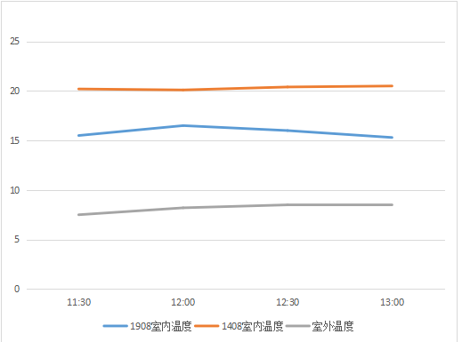 从图3.8中可以看出,1908室内的温度基本稳定在20℃左右,符合本小区的供暖设计要求,也符合相关规定;同样的可以看出,1408室的温度仅仅在15℃~17℃附近徘徊,且测试时间为当天中午,室外气温最高的时间。这两个测试对象位于同一单元内同一户型不同楼层内,但是室内温度的差别可以达到5℃以上,这说明本集中供暖系统很可能存在比较严重的冷热不均现象,作为用户,在缴纳相同暖气费的情况下,却不能得到相同品质的供热服务,某些用户意见较大。根据物业反应的投诉及摸排情况,也能证实以上现象绝非孤例,这里由于篇幅的关系和入户调查的困难性,就不一一列举了。