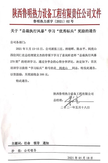 通过分享会的心得分享评比,决定如下:首次培训学习获得“学习标兵”称号的是阎虎山同志,特发此通告,以资鼓励,另奖励现金300元。